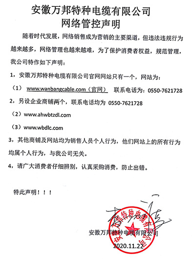 鄭重聲明:安徽萬邦特種電纜有限公司官方網站為:www_wanbangcable_com.hongyugk.cn,除此之外無任何子網站或合作網站,其余均為假冒偽劣。電話:0550-7621728 13485756353 地 址:安徽省天長市滁州高新技術產業開發區經四路29號